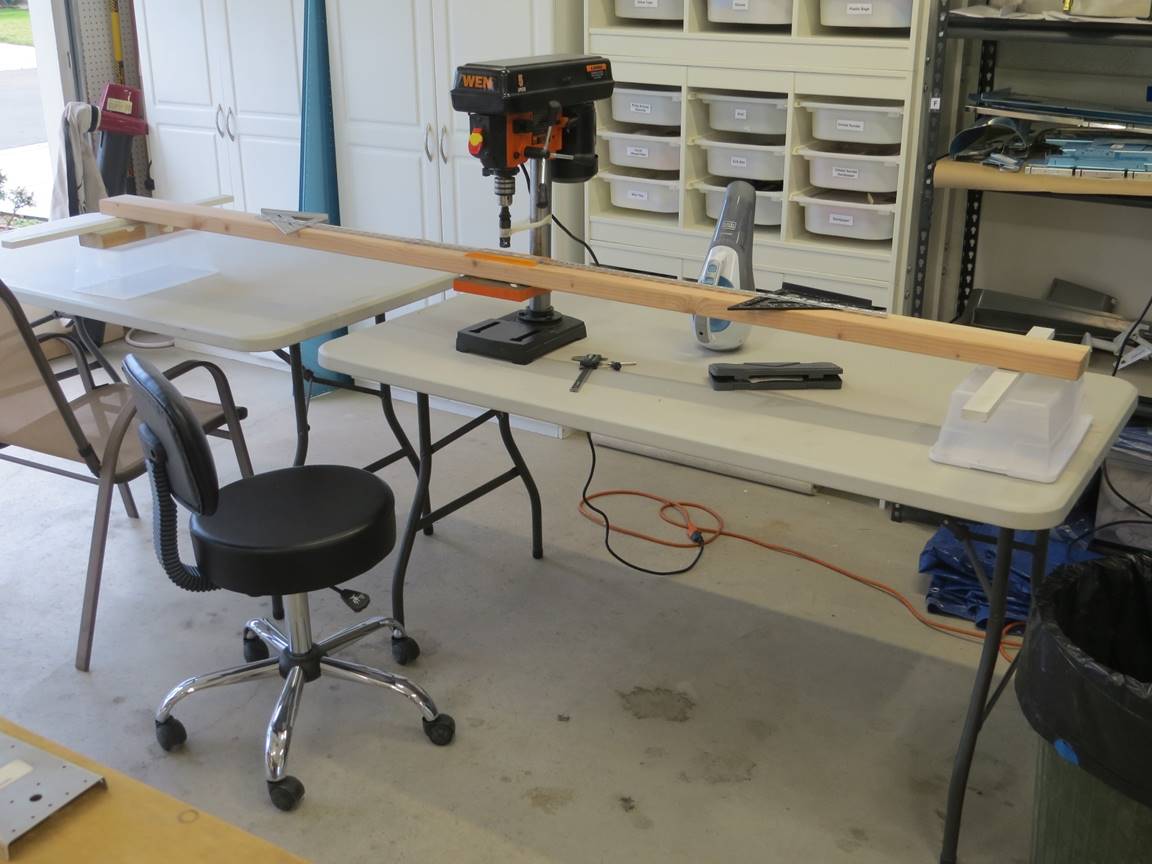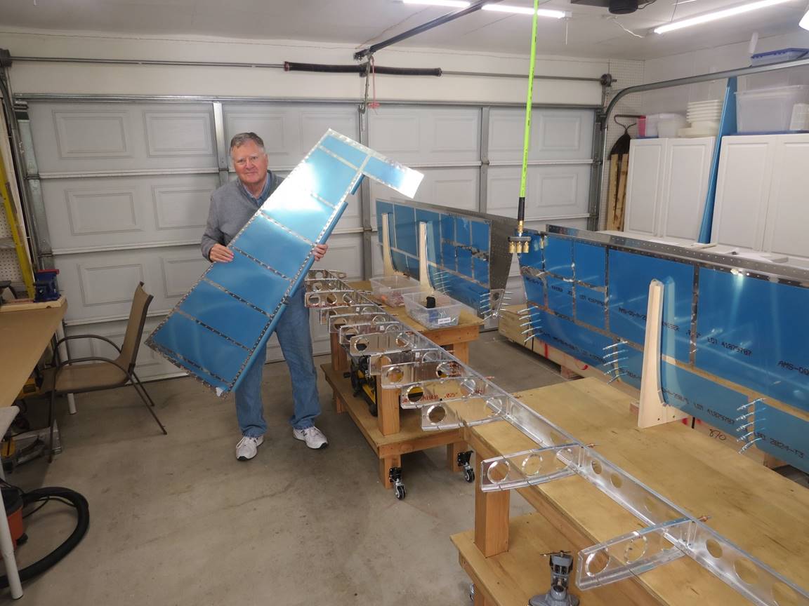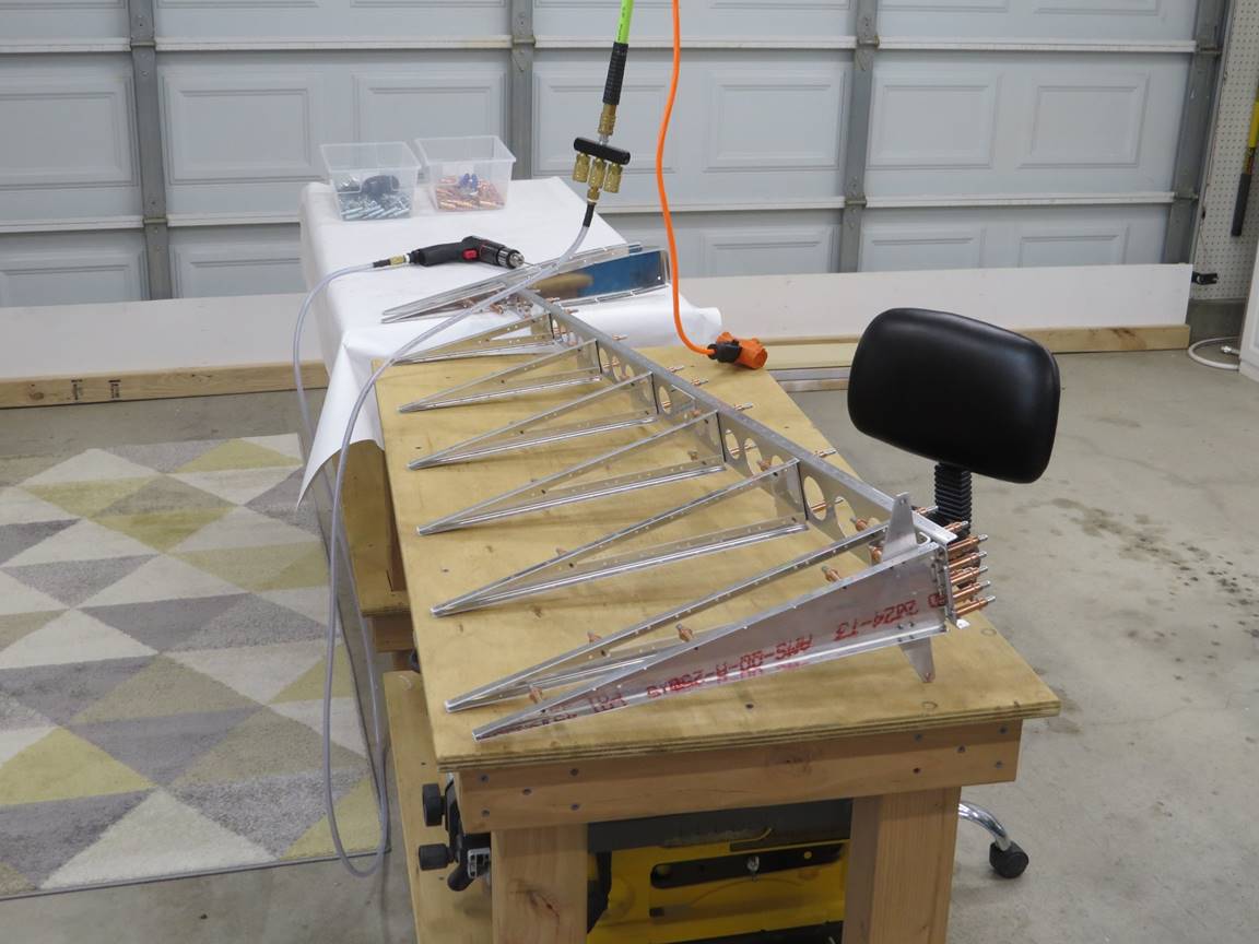 · Tom arrived on 3/8/2023. He has been working on the horizontal stabilizer while I finished the rudder. You can see the skeleton for the horizontal stabilizer on the work benches.