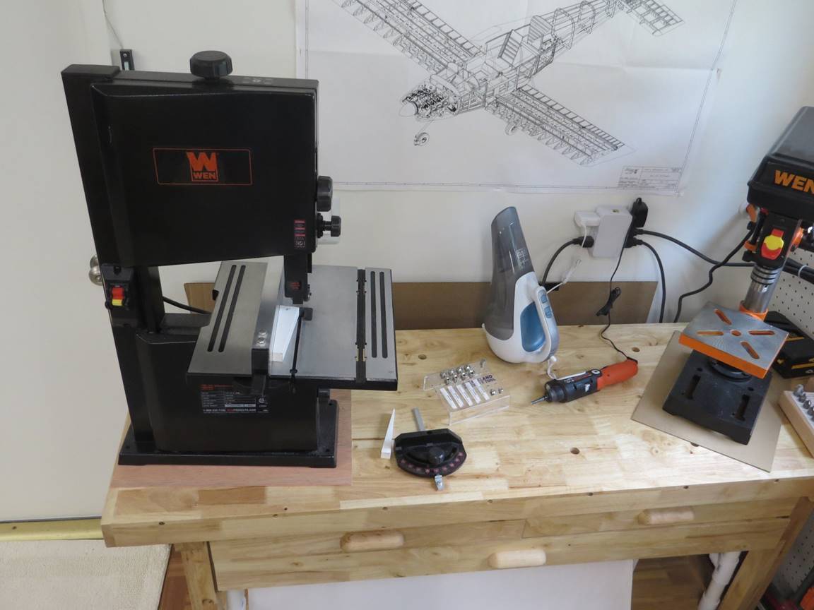 · Note the little white jig on the band saw. This is just a piece of 1”x2” PVC cut at an 8 degree angle. All of the ribs for the rudder have to be trimmed the same way, and this made the cuts straighter and more uniform.