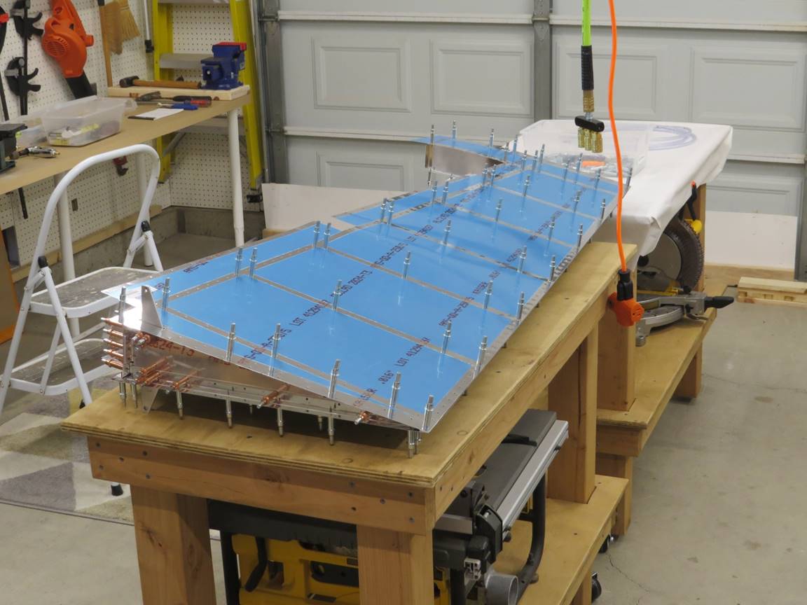 · This is the setup for countersinking the trailing edge of the rudder. The piece of metal taped to the 2x4 is a wedge that Cleaveland Aircraft sells. It has the right angle for countersinking the trailing edge.
